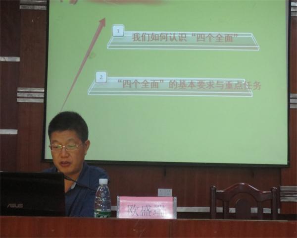 欧校长首先对15级学生参与培训的积极与热情给予赞赏和肯定,并对同学们的发展和成长寄予深切希望。随后欧校长一一阐述了如何认识“四个全面”,即全面建成小康社会、全面深化改革、全面依法治国和全面从严治党。欧校长深入诠释了各个“全面”的意义、定位、基本要求与重点任务,为学生展现了新时期中国共产党理政方略与时俱进的新创造、马克思主义与中国实践相结合的新飞跃最后,欧校长对学生寄予深切希望,并提出,希望在座同学从思想和行为两个方面严格要求自己,争取早日加入党组织。