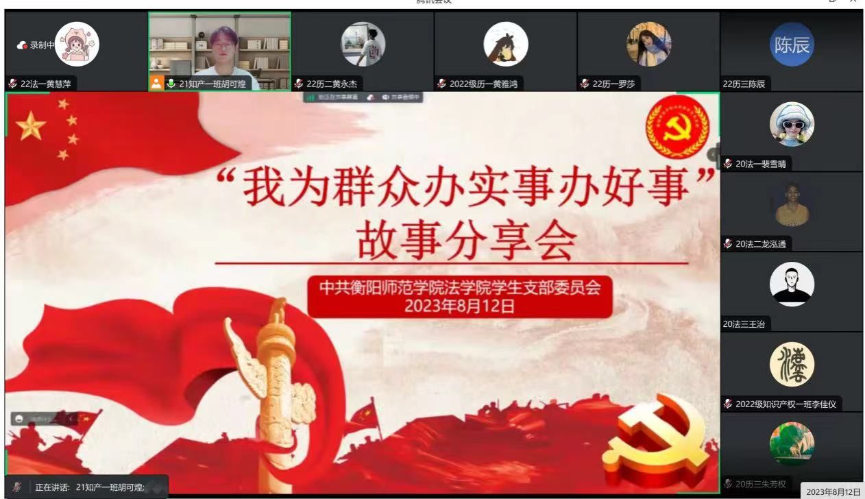 8月12日,yl8cc永利官网党支部开展“我为群众办实事办好事”线上故事分享会主题党日活动。本次活动全体学生党员以及部分入党积极分子参与,由2021级知识产权一班胡可煌担任主持人,特邀请毕业生党员陈超同志、张虎生同志和李幸妮同志参会。