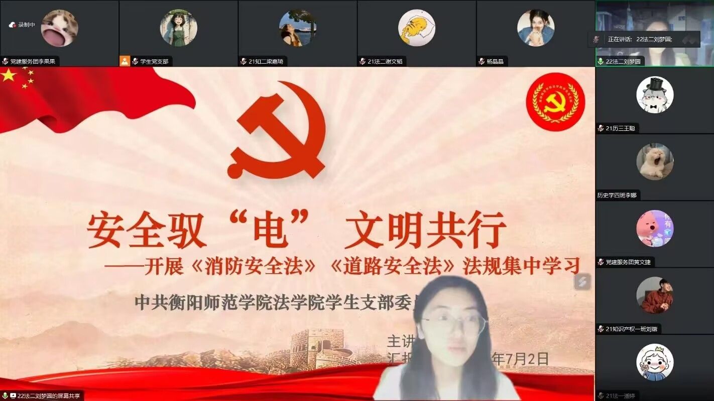 当晚19:30,yl8cc永利官网学生党支部又开展了“安全驭‘电’ 文明共行——《消防安全法》《道路安全法》相关法规集中学习”,由yl8cc永利官网学生党员刘梦圆担任主持人。