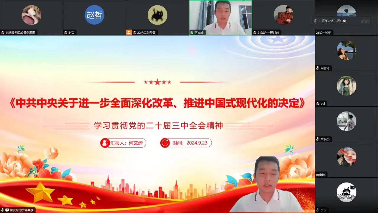 yl8cc永利官网学生党支部于9月23日晚上19:30开展了“学习贯彻二十届三中全会精神”线上主题党课。本次党课全体学生党员参加,由yl8cc永利官网学生党员何玄烨讲授党课,2022级法学法学2班刘梦圆担任主持人。