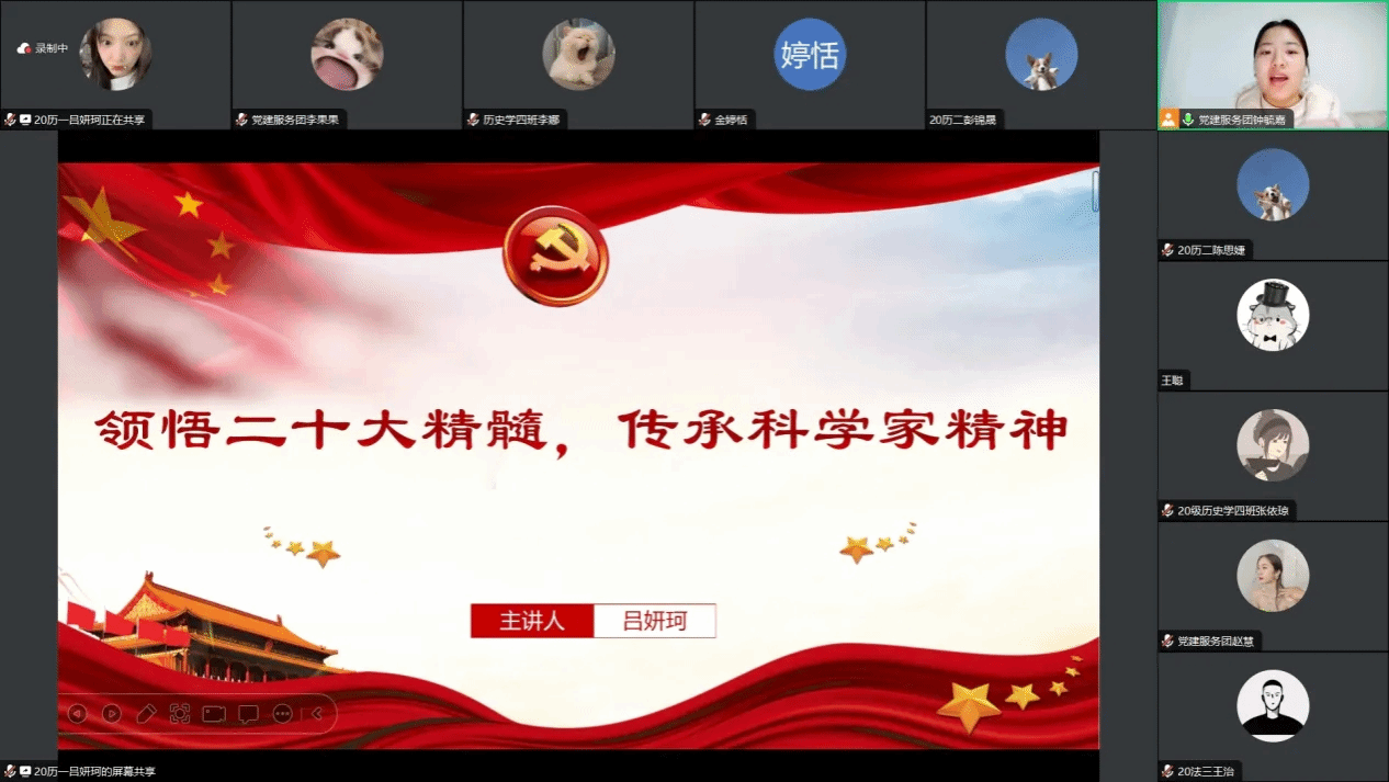 2月22日19:30,yl8cc永利官网学生党支部开展了“领悟二十大精髓,传承科学家精神”线上主题党课。此次党课全部学生党员参与,由yl8cc永利官网学生党员吕妍珂讲授党课,2022级历史学3班钟毓嘉担任主持人。
