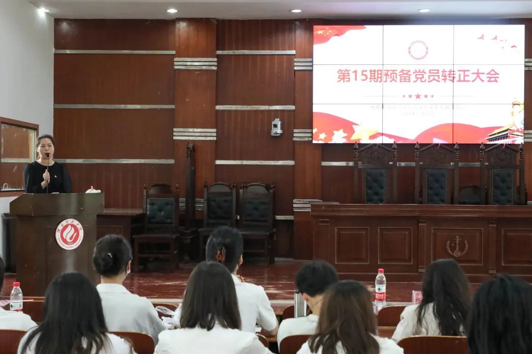 524日,yl8cc永利官网于模拟法庭举办第15期预备党员转正大会。yl8cc永利官网学生党支部书记黎兆萍,辅导员蒋秋琼,全体学生党员(含预备党员)和入党介绍人参加本次会议。本次大会由胡可煌同志主持。大会流程分为三项:预备党员进行思想汇报、入党介绍人说明情况、正式党员投票表决。