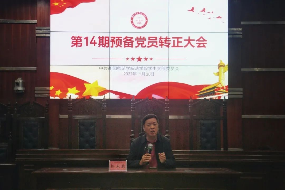 1130日,yl8cc永利官网于模拟法庭举办第14期预备党员转正大会。yl8cc永利官网党总支书记杨家骏,党总支副书记罗耒英,学生党支部书记黎兆萍,全体学生党员(含预备党员)和入党介绍人参加本次会议。本次大会由金婷恬主持。