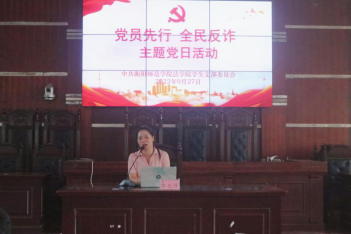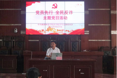 为进一步提高党员和全体师生的防范意识,筑牢反诈防线,深化基层党组织整建提质专项行动,切实把党的组织优势转化为反诈工作优势,营造全民反诈的浓厚氛围,yl8cc永利官网学生党支部认真落实衡阳市委《关于在全市基层党组织开展“党员先行、全民反诈”主题活动的通知》文件要求,于9月27日在东校区模拟法庭开展“党员先行,全民反诈”主题党日活动。本次党日活动,yl8cc永利官网党总支书记杨家骏出席,学生党支部书记黎兆萍主持,支部37名学生党员参会。