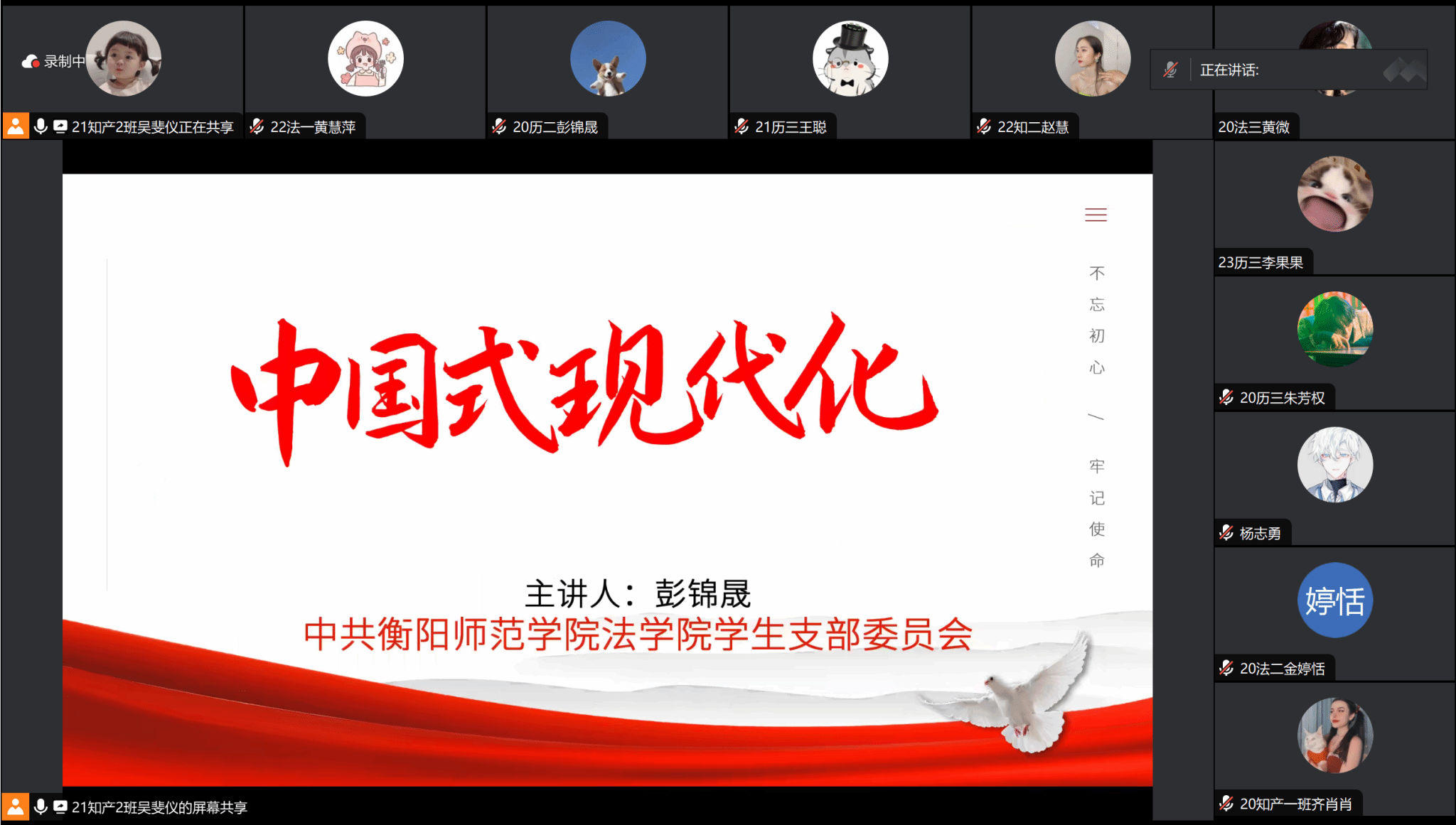 10月17日晚上,yl8cc永利官网学生党支部开展了“中国式现代化”线上主题党课。此次党课全部学生党员参与,由yl8cc永利官网学生党员彭锦晟讲授党课,2021级知识产权2班吴斐仪担任主持人。