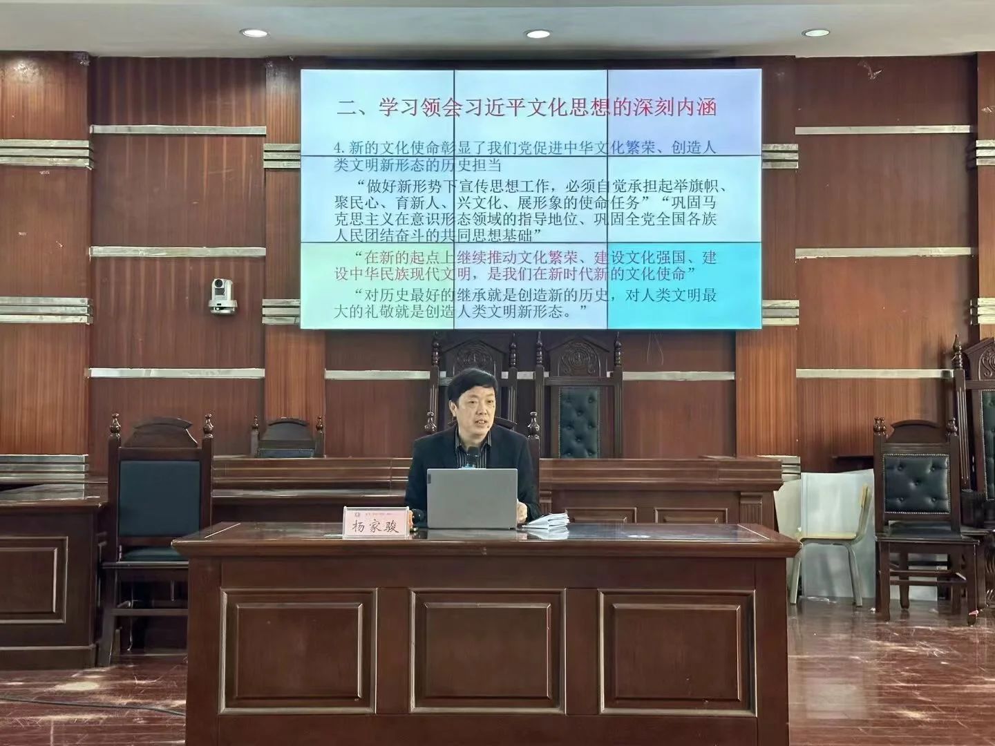 11月28日下午,yl8cc永利官网党总支书记杨家骏以“深入学习领会习近平文化思想”为题在东校区模拟法庭主讲专题党课,学院全体教职工党员、学生党员与主要学生干部聆听了本次党课。