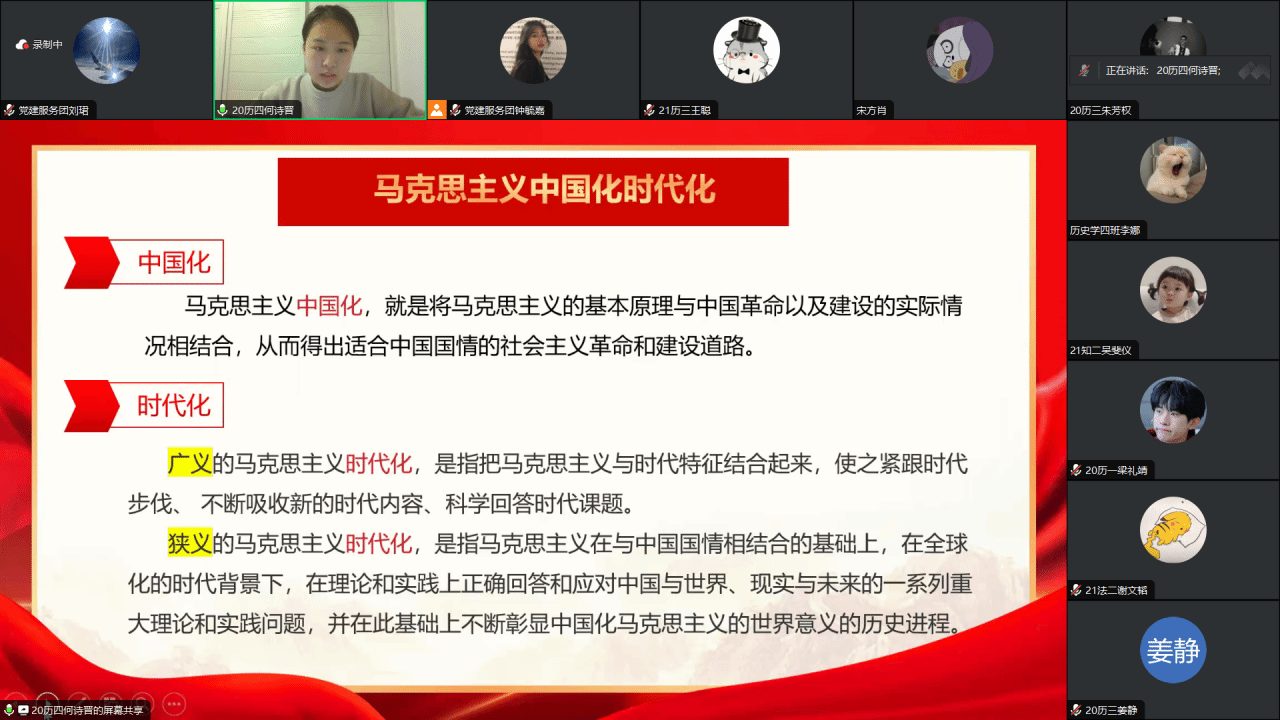 12月14日19:30,yl8cc永利官网学生党支部开展了“不断推进马克思主义中国化时代化”线上主题党课。此次党课全部学生党员参与,由yl8cc永利官网学生党员何诗晋讲授党课,2022级历史学3班钟毓嘉担任主持人。