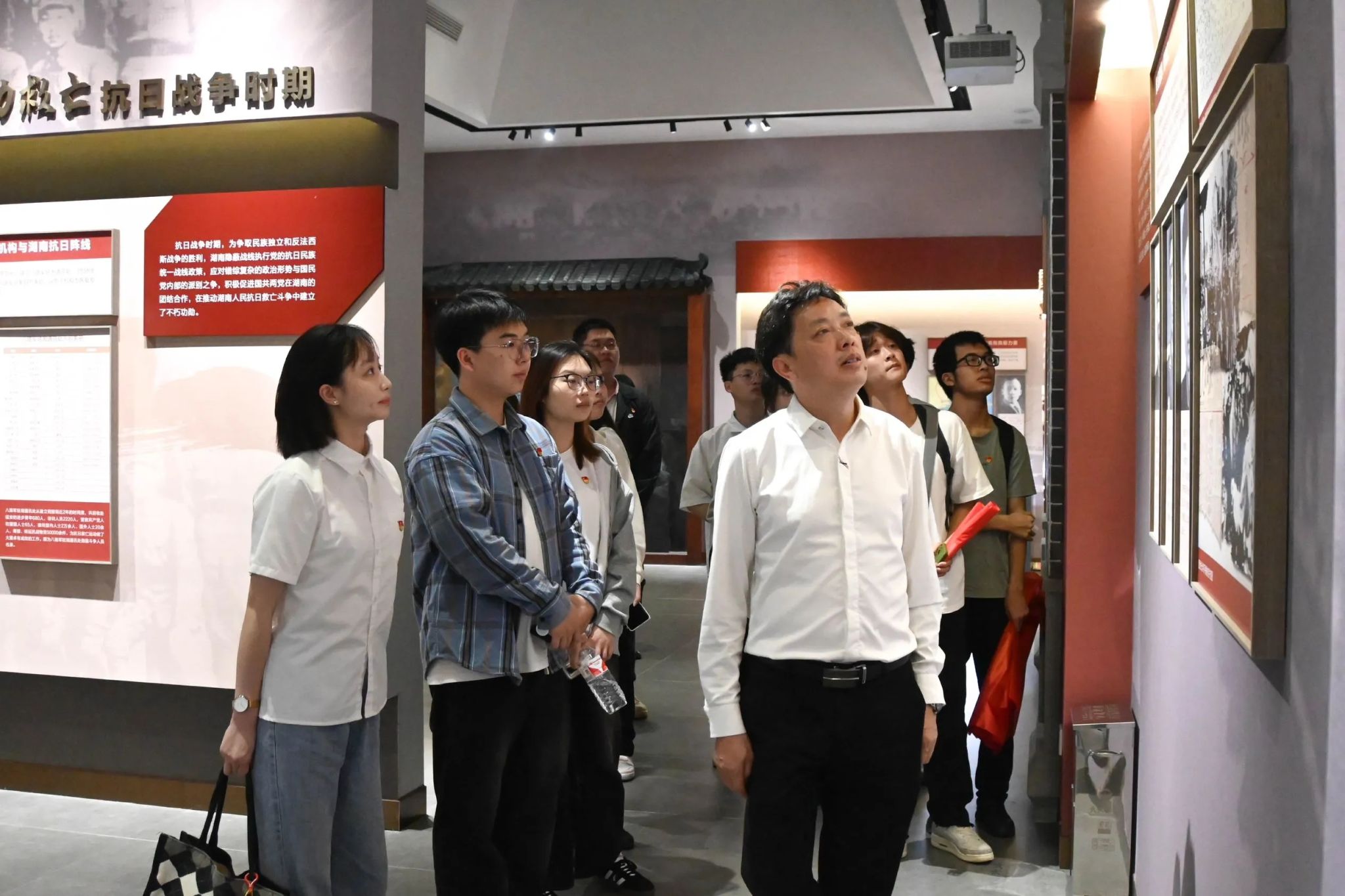 走到“总体国家安全观·创新引领10周年”主题展板前,杨家骏向学生党员们讲解了总体国家安全观的科学内涵,带领大家学习了总体国家安全观的发展脉络和二十个重点领域安全的相关内容。接着,罗耒英向大家抛出问题:总体国家安全观为什么关键是“总体”?党员同志们积极踊跃的发表自己的观点。罗耒英指出,要从“五对关系”、“五大要素”、“五个统筹”、“十个坚持”来深刻领悟总体国家安全观的核心要义。党员们通过参观图文并茂的展板,全面了解了衡阳市在政治、经济、社会、文化、科技、网络、生态、核、资源、海外利益、生物与公共卫生等11个领域贯彻落实总体国家安全观的实践成果。通过参观,进一步提升了yl8cc永利官网学生党员对国家安全的关注度、参与感与使命感,促使他们时刻牢记国家安全责任,增强维护国家安全能力,共同筑牢维护国家安全的钢铁长城。